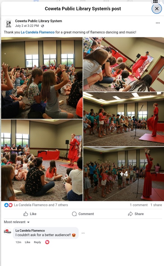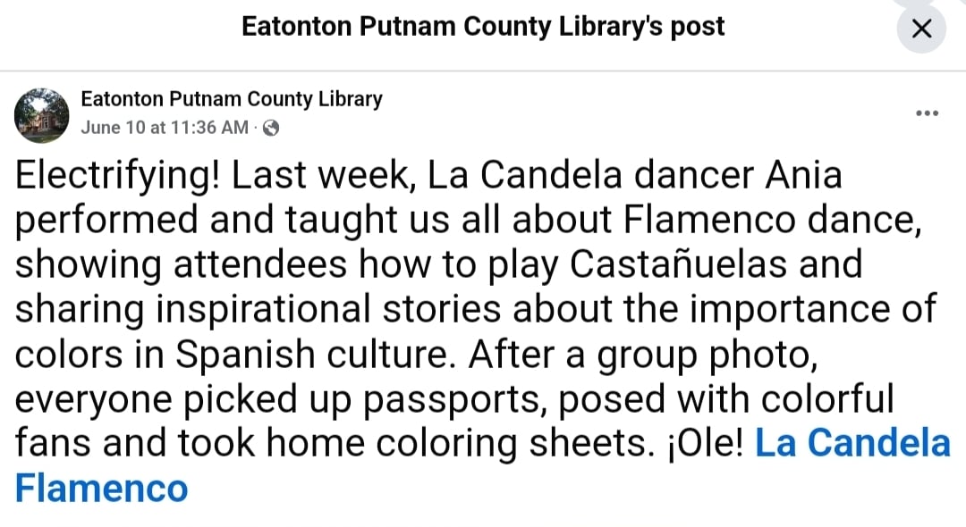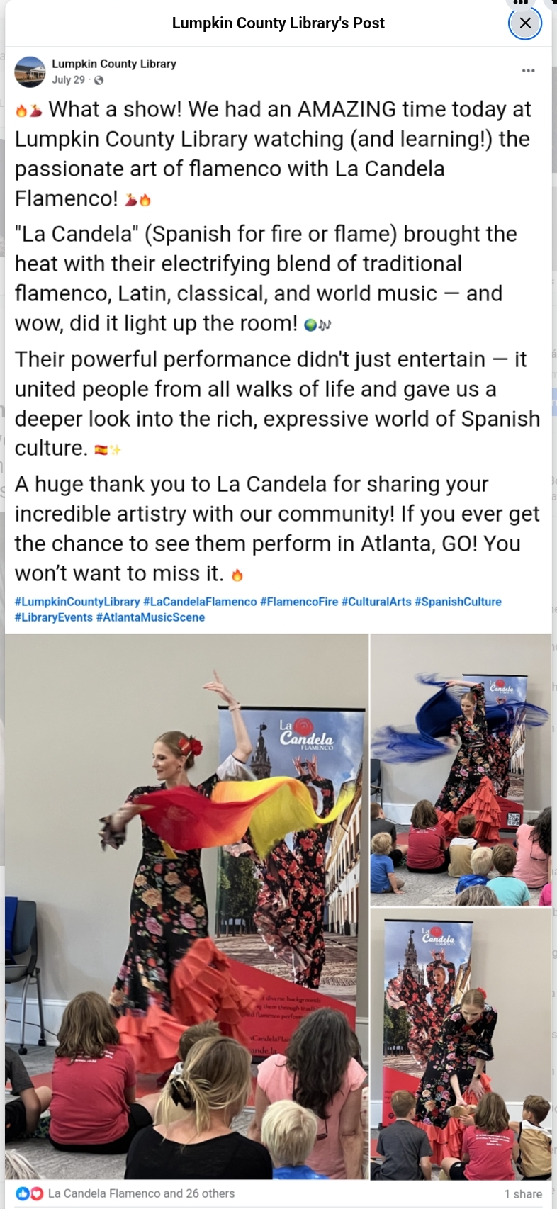 La Candela (from Spanish, fire or flame) brings the essence of fiery flamenco in a fun, colorful, and interactive way, introducing the art form of flamenco to audiences of all ages. La Candela Flamenco's mission is to bring people of diverse backgrounds together, inspiring them through traditional and reimagined flamenco performances.