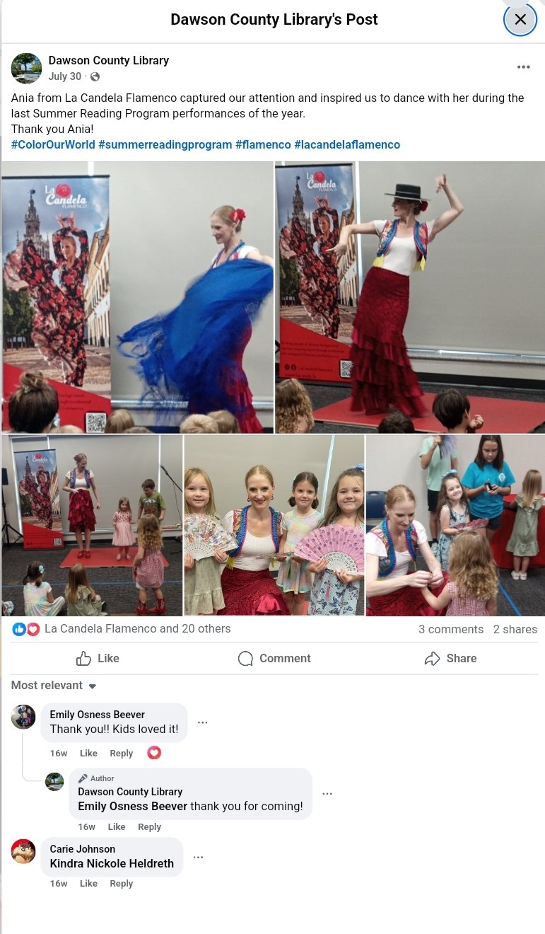 Ania Bartelmus, "La Candela," is a flamenco dancer, choreographer, teaching artist, and founder of La Candela Flamenco. She is dedicated to sharing her passion for flamenco with audiences of all ages. Candela has produced numerous flamenco shows and performed at cultural events across Georgia, nationally, and internationally.
