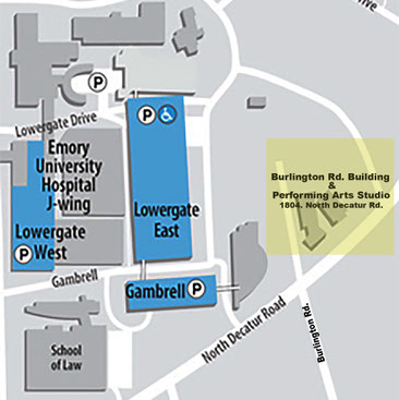Exit Lowergate East Parking Deck using the exit or stairwell nearest the North Decatur Building (eastern end of the parking deck on the same side as the entrance). Walk around the right side of the North Decatur Building to North Decatur Road. Go east (left) on North Decatur to Burlington Road. Cross Burlington and continue straight to the Performing Arts Studio (a brick building once used as a church) at 1804 North Decatur Road on the left.